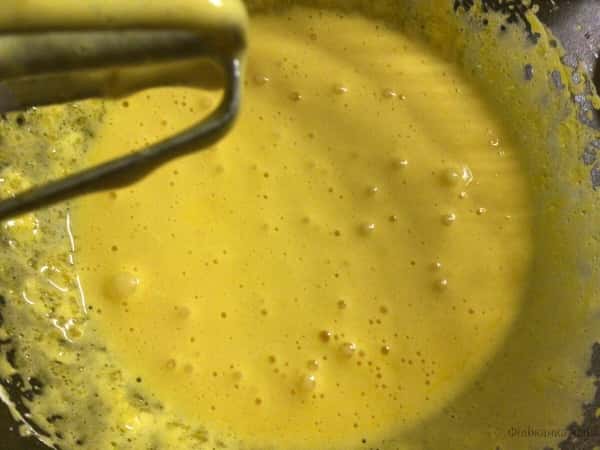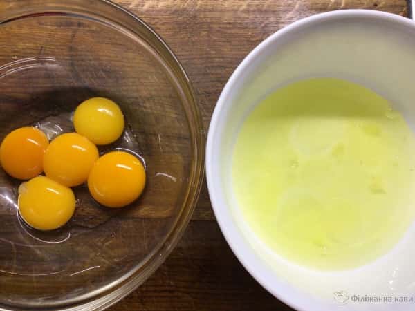 Потім збиваємо жовтки з рештою 1/3 частиною цукру до пишної маси.