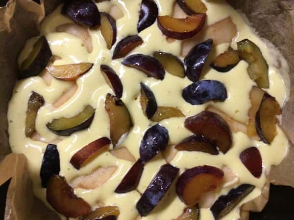 Потім на тісто викладаємо груші і сливу, або інші фрукти за бажанням!