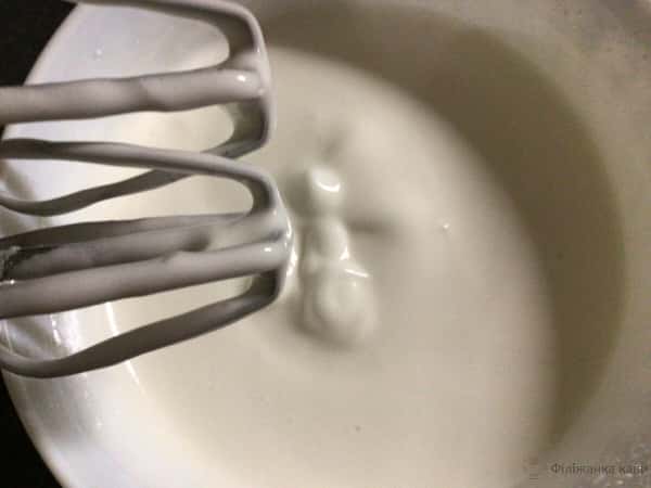 Спочатку міксером збиваємо білки з 2/3 частинами цукру. Цукор в білки додаємо порціями, і збиваємо до м’яких піків.