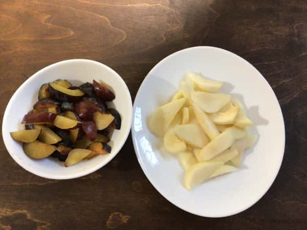 Сливи нарізаємо на довільні шматочки. Груші очищаємо від шкірки і нарізаємо на пластинки.