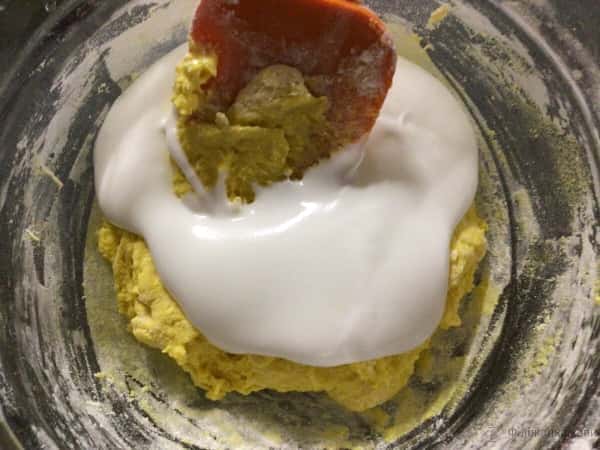 Потім в цю масу невеликими порціями додаємо білки. Після кожної порції білків ретельно перемішуємо масу, щоб не залишилося грудочок.