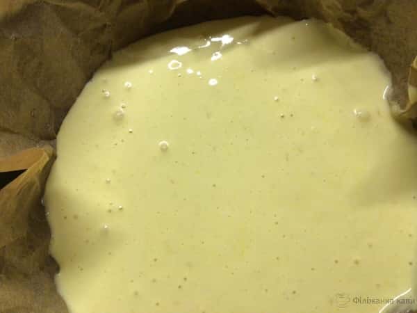 Потім половину маси перекладаємо на деко. На цей раз я випікала пиріг на глибокій сковороді, тому застелила її пергаментом.