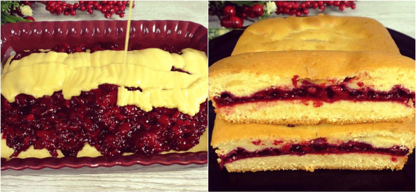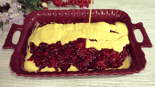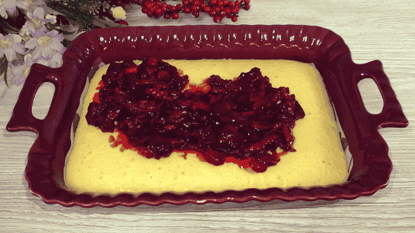 У форму вилити половину тіста і відправити в духовку, випікати основу при 180 градусах 15-18 хвилин. Намагайтеся тісто розділити рівно, тоді пиріг в розрізі вийде гарний, начинка буде в середині, я трохи перелила тісто в основу, на смак це звичайно ж не вплинуло.