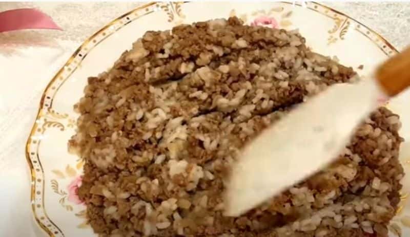 - Відварюємо рис у підсоленій воді, охолоджуємо та змішуємо з фаршем. Начинка готова.