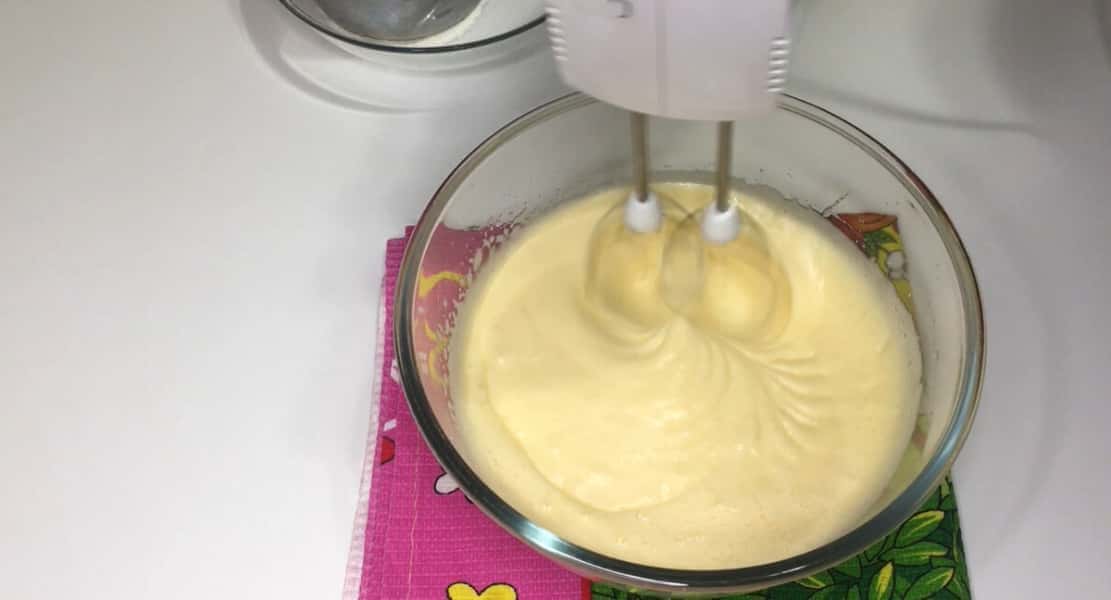У чашу для просіювання борошна всипаємо 250 г борошна, додаємо щіпку ванілі і 10 г розпушувача, розмішуємо і просіюємо в яєчно-масляну суміш, на низьких обертах міксера замішуємо тісто.