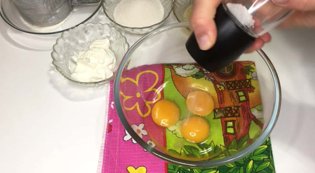 У миску вбиваємо 3 яйця, додаємо щіпку солі, злегка збиваємо і додаємо 120 цукру, і продовжуємо збивати до збільшення маси в об’ємі та освітлення, ну і звичайно ж, щоб цукор розчинився.