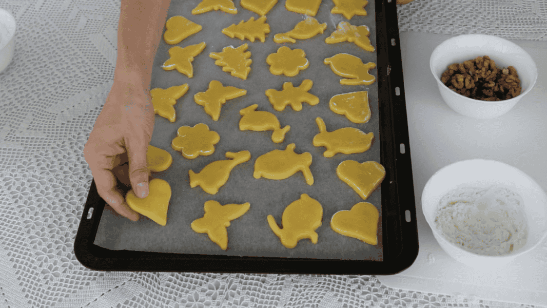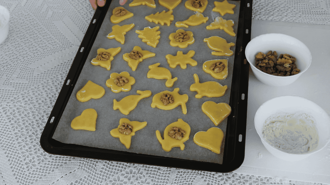 Печиво кладемо на лист з пергаментом. За бажання можна вдавити половинку або четвертинку волоського горіха.