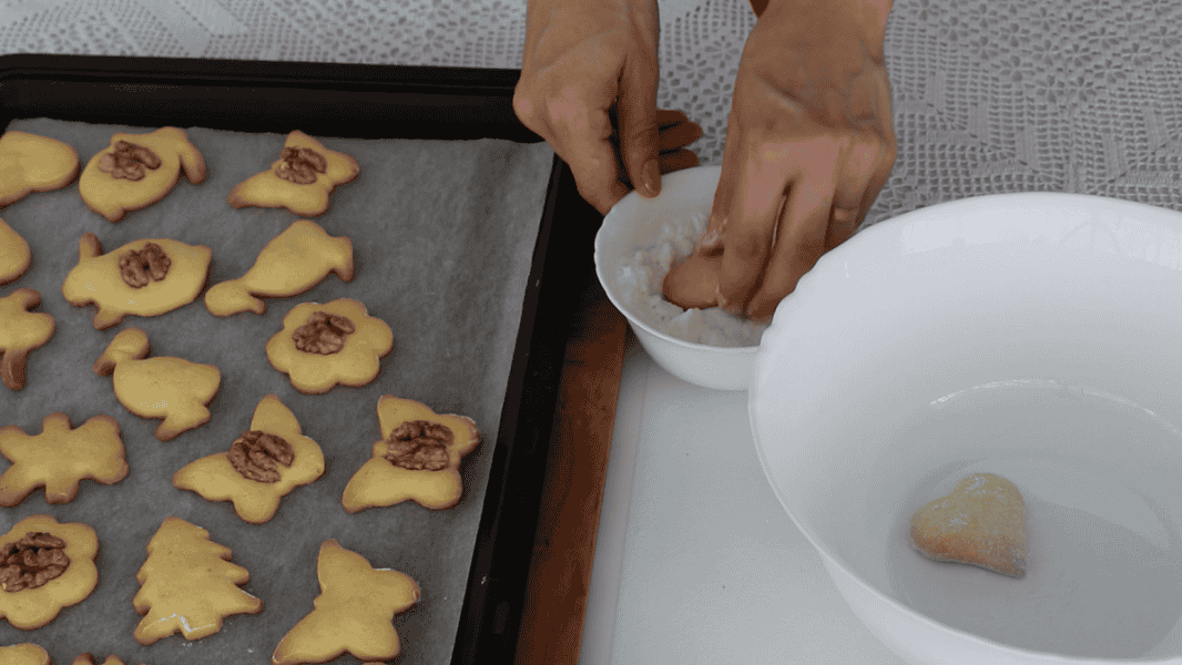 Ще гаряче печиво обвалюю у цукровій пудрі.