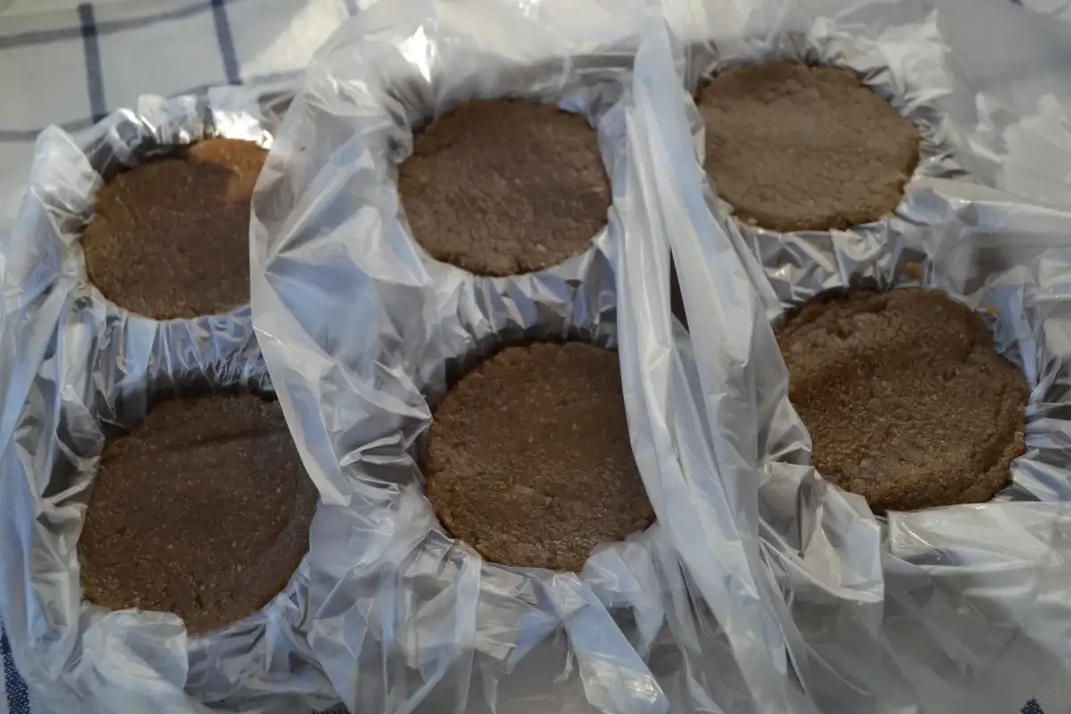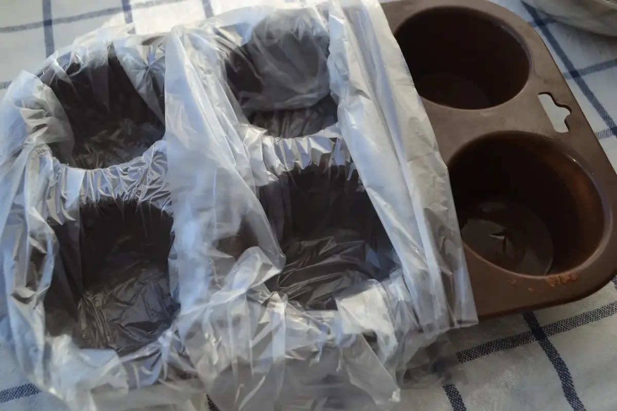 Цього разу вирішила не надавати халві квадратної форми, а розкласти по силіконових формах для кексів. Для цього форму накриваю поліетиленовими пакетами як на фото нижче