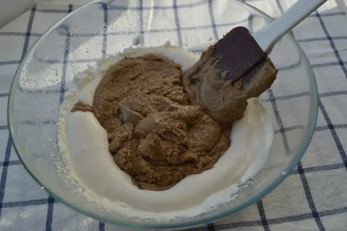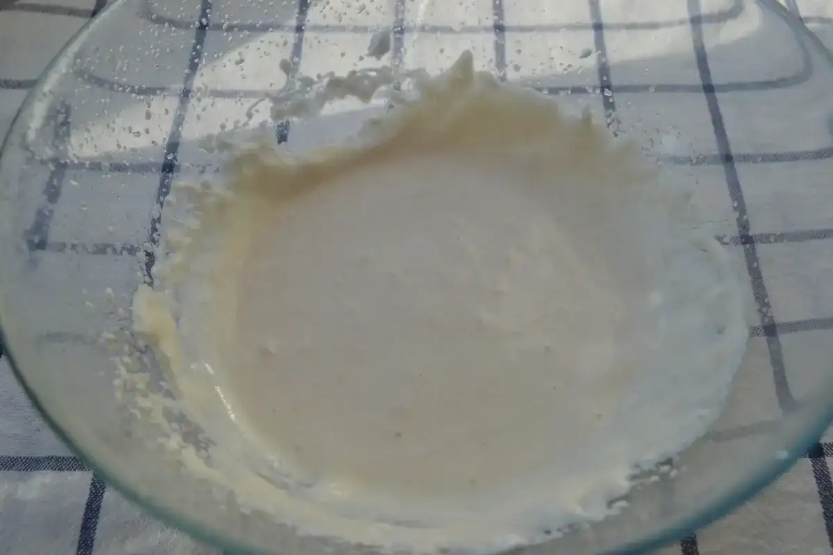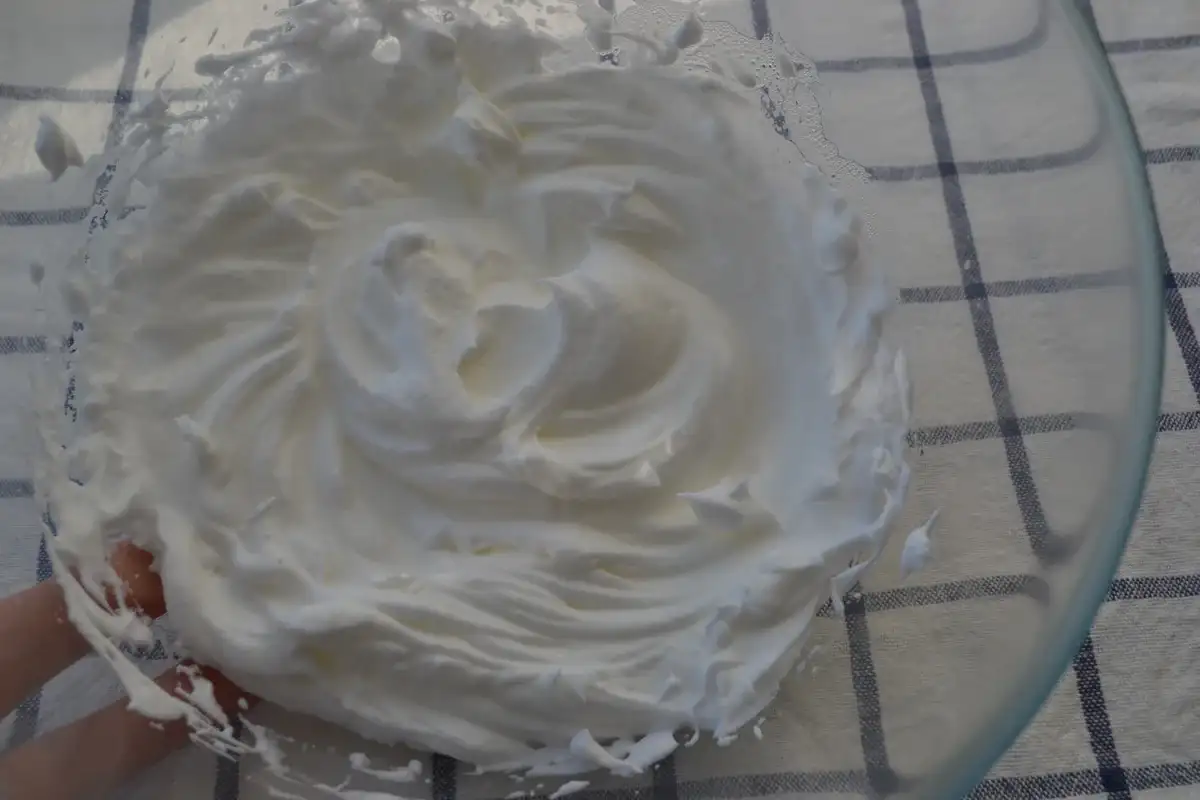 А потім акуратно вливаємо отриманий сироп з води та меду в білок, при цьому потрібно постійно збивати міксером масу на повільній швидкості.