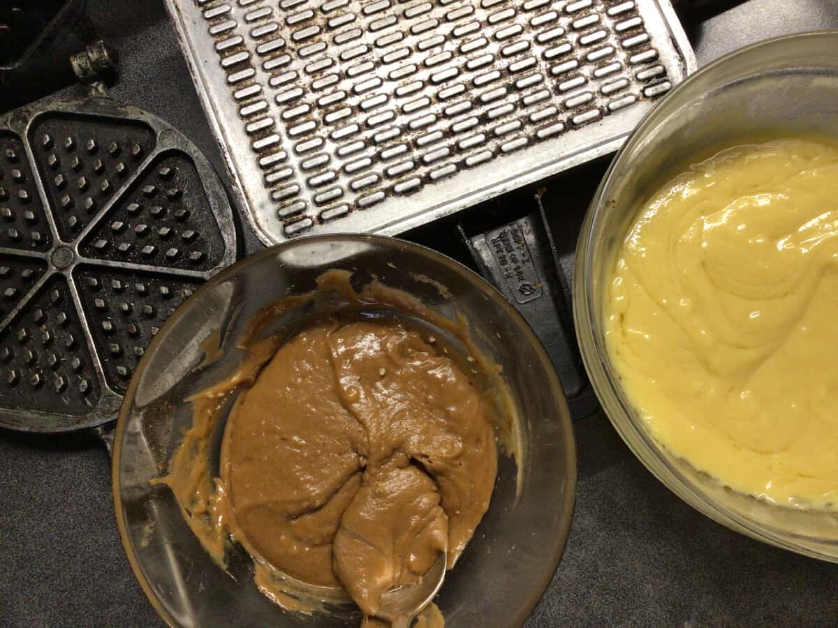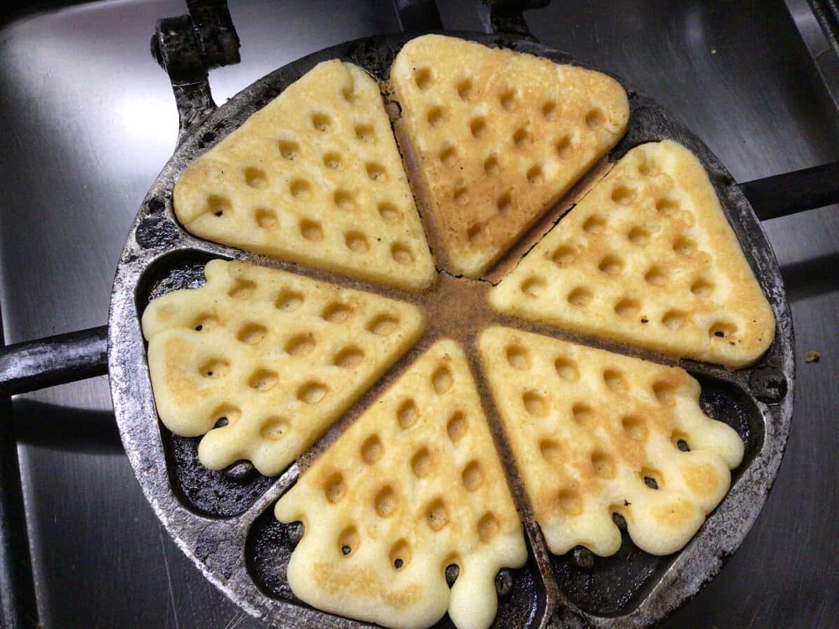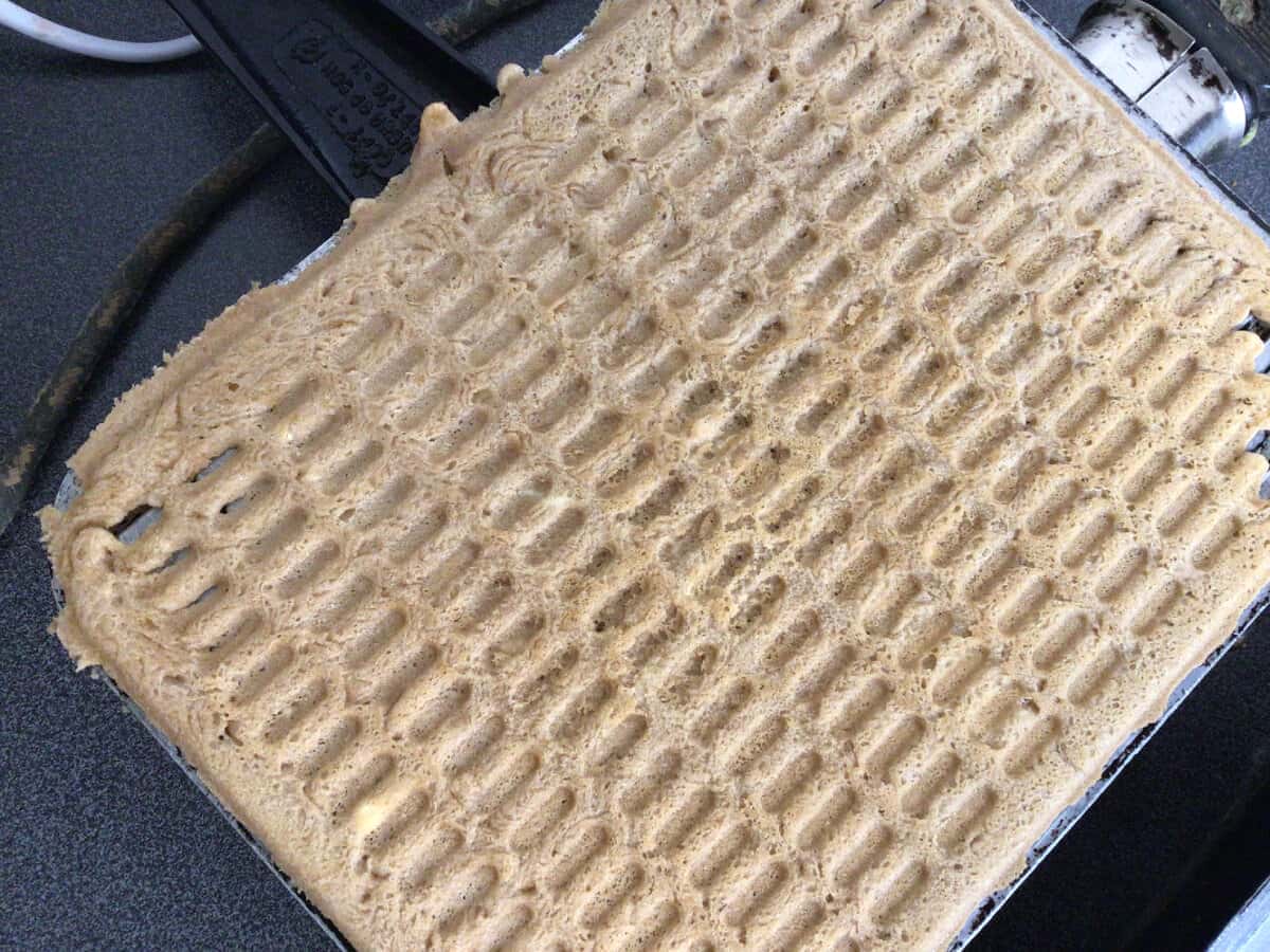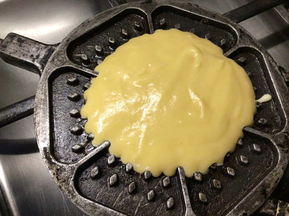 Буду робити все і відразу. Нагріваємо електровафельниці і відразу нагріваємо на плиті форму. Коли все добре нагрілося, то обов’язково один раз змащую форми олією і по одній ложці викладаю тісто. Накриваю іншою половинкою і випікаємо.