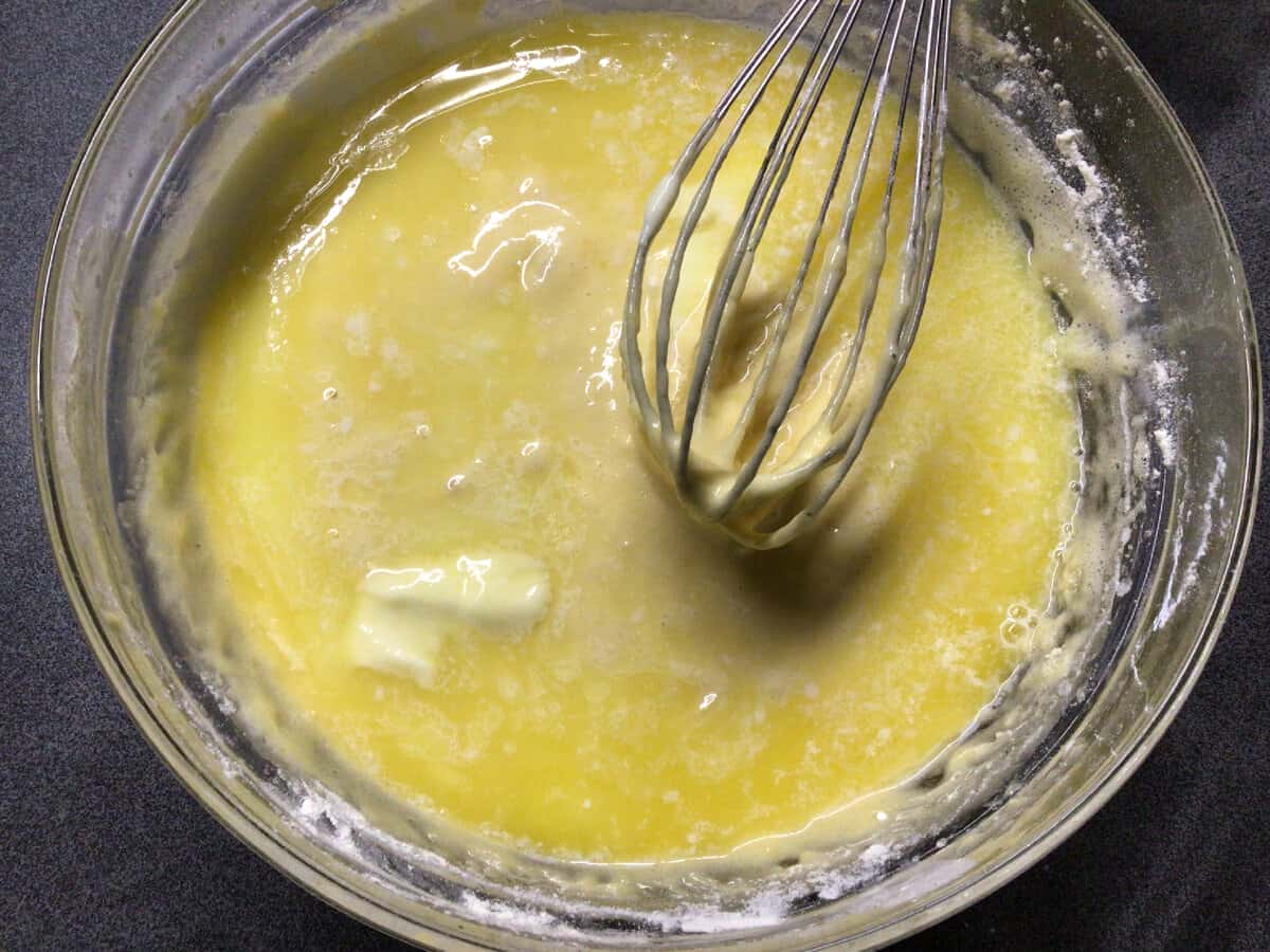 Наступний крок, додаємо розтоплене вершкове масло і вінчиком намагаємося вмішувати масло в досить густе тісто.