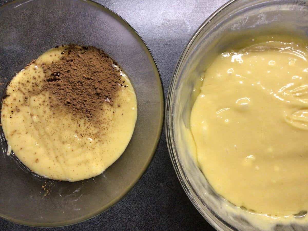 Далі вже пішла моя імпровізація. Розділила тісто на дві миски і в одну додала какао-порошок. Вінчиком добре розмішала.