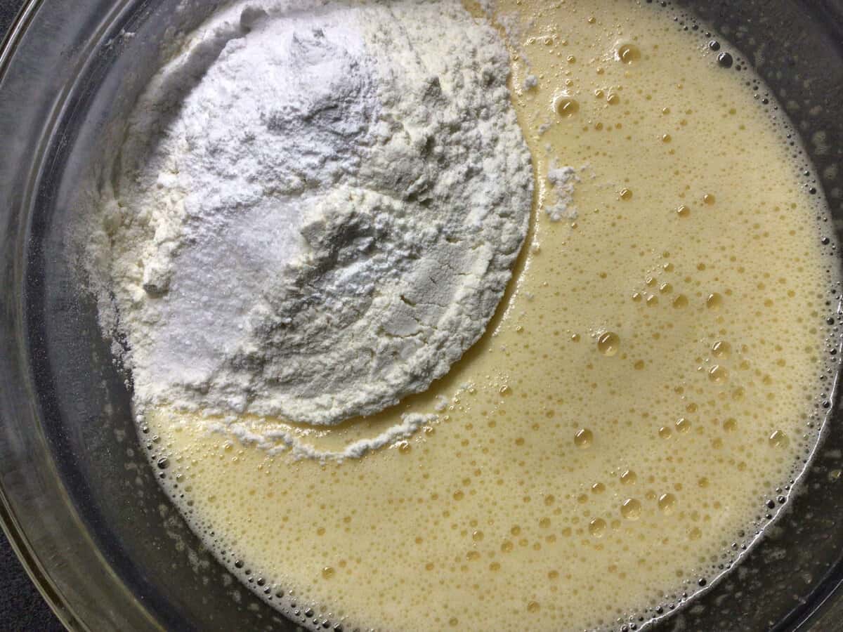 Далі в яєчну масу додаємо борошно з розпушувачем і сіллю і все, ще раз міксером добре з’єднуємо. Розбиваємо всі борошняні грудочки.