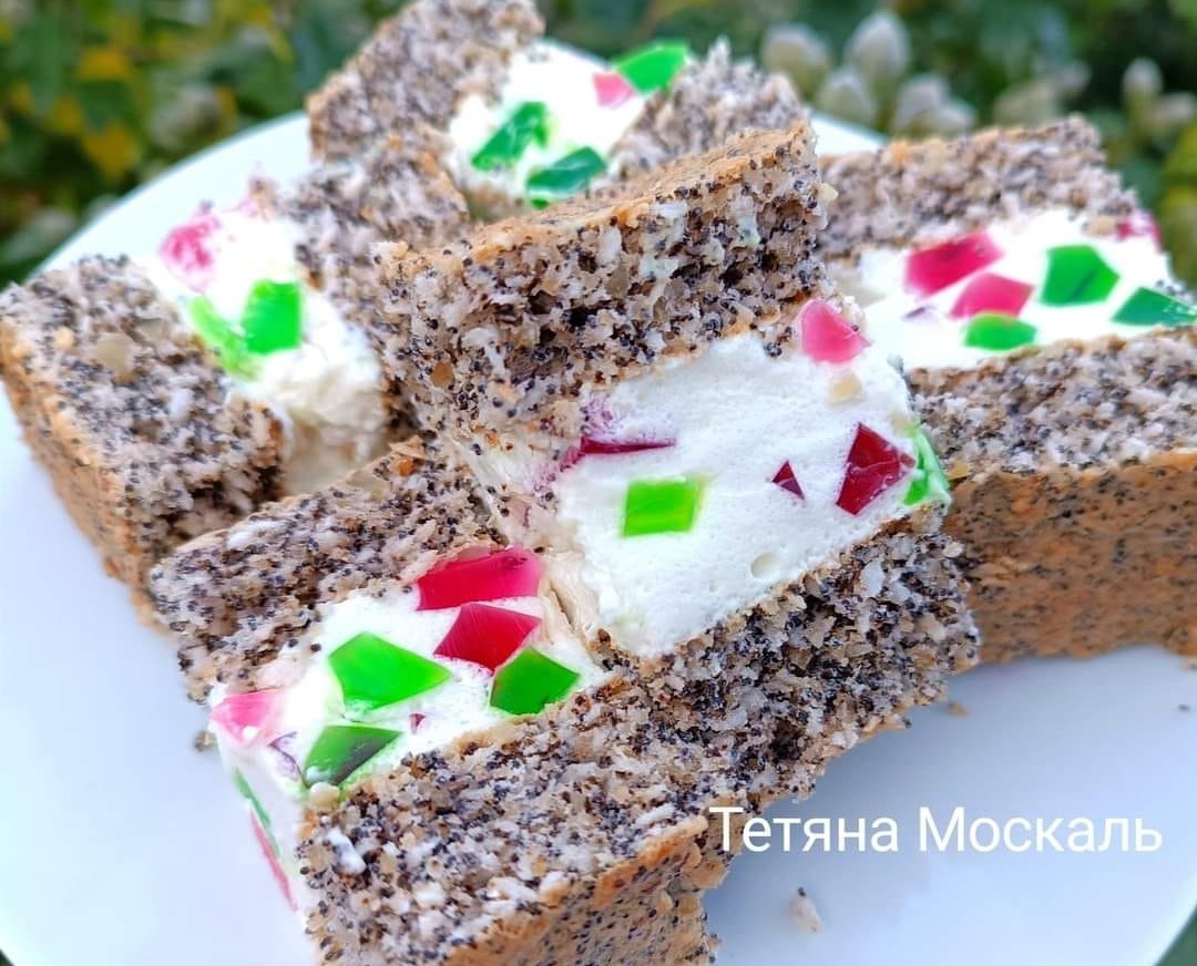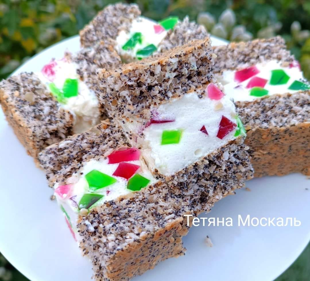 Додати кубиками желе, різних кольорів. На 1 п желе -170 мл води, розварити, поставити, щоб повністю застигло.
