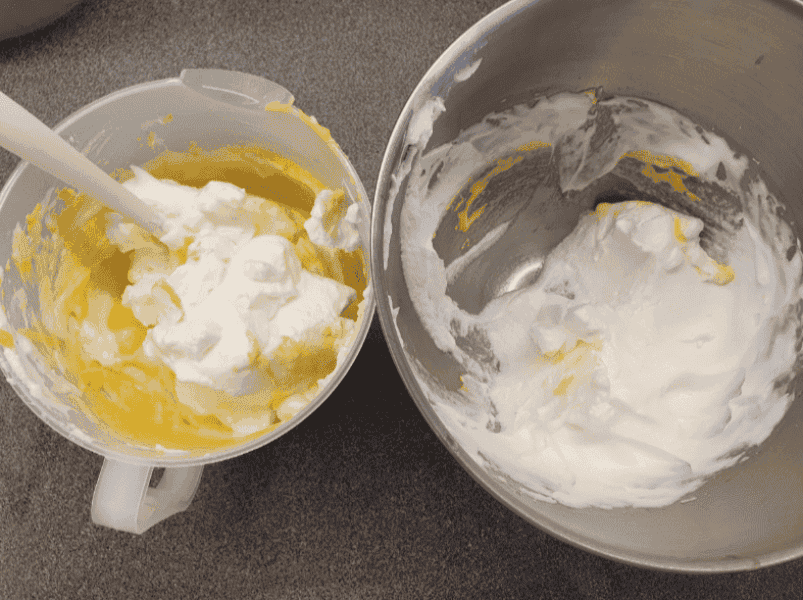 Приблизно в 3 заходи додати всі білки. Перемішувати акуратно, піднімаючи лопатку з дна, щоб білки не осіли.