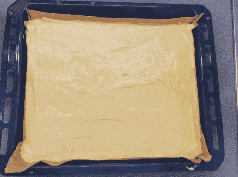 На деко вистелити пергамент і загнути борти, щоб тісто не витекло. Розподіляємо тісто по пергаменту рівномірно, заповнюючи кути.
