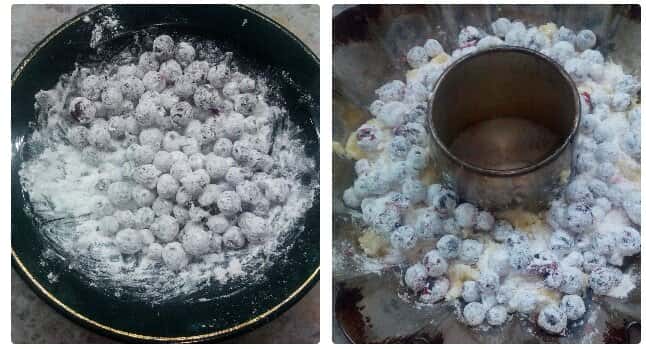 Чорну смородину, не розморожуємо, обвалюємо в кукурудзяному крохмалі і викладаємо поверх тістау.