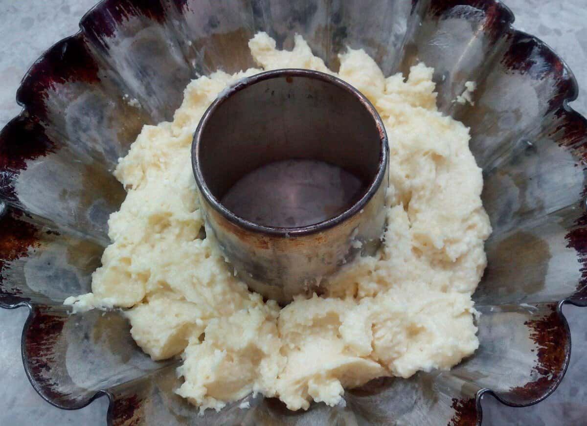 Форму для кексу змащуємо маргарином або маслом і викладаємо половину тіста.