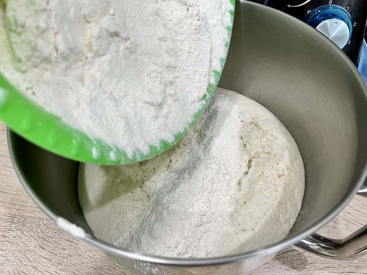 Виливаємо опару в простору ємність, додаємо інші інгредієнти зі списку. Всі продукти повинні бути кімнатної температури, вершкове масло – м’яким.
