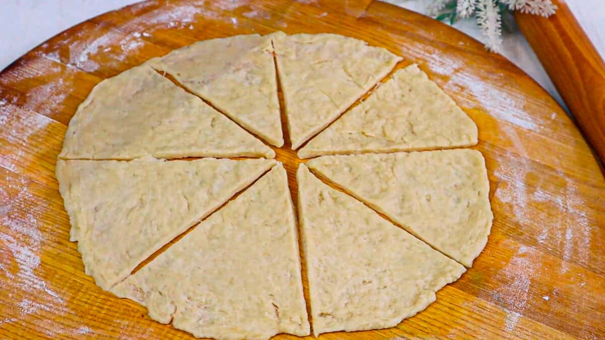 Ділимо тісто на 2 частини і розкачуємо. Кожну з частин ділимо на 8 частин ( вийде 16 рогаликів )