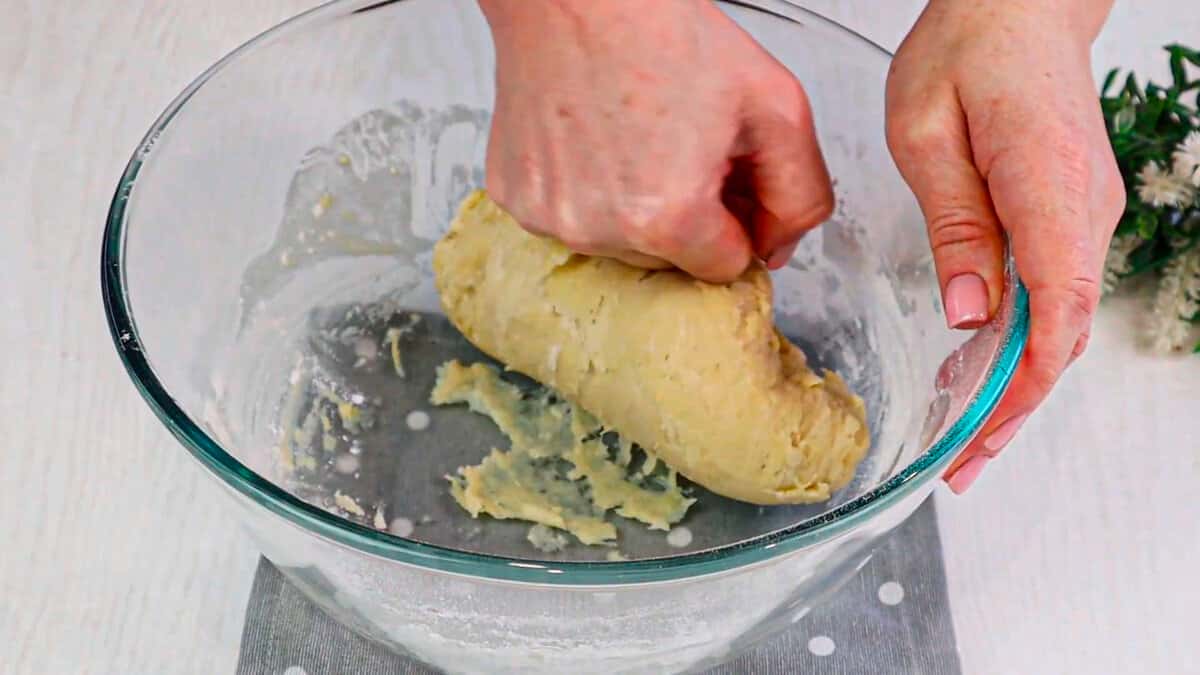Далі просіюємо борошно 300 г і 2 ч. л. розпушувача. Спочатку перемішуємо потім місимо тісто руками.