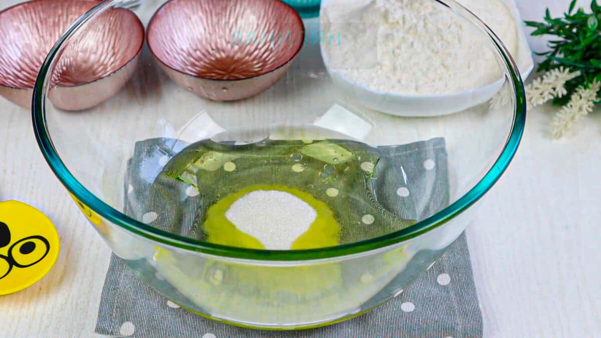 У миску додаємо воду 100 г, олію 100 г, 2-3 ст. л. цукру, 2 г ваніліну і перемішуємо до розчинення цукру.