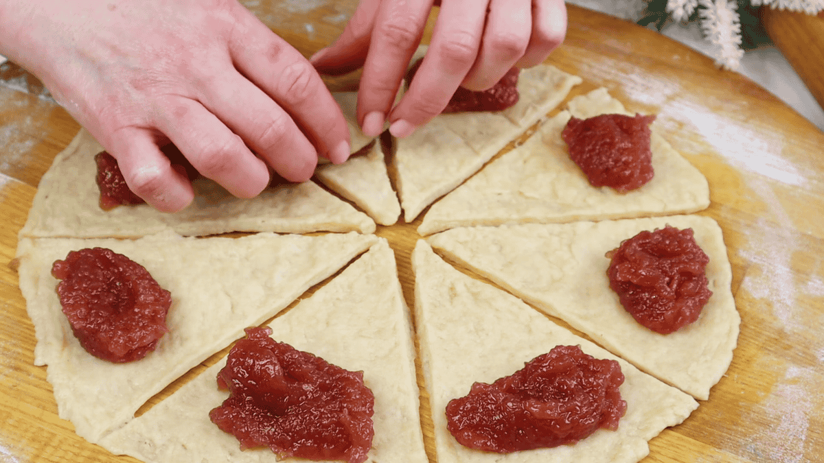 Додаємо повидло, густе варення або джем і закручуємо в рогалик.