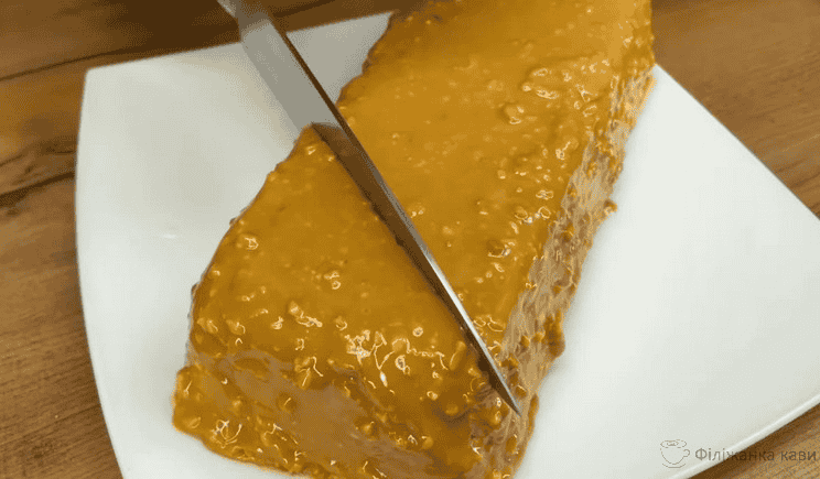 5. Далі зверху на десерт поливаємо арахісовою пастою. Нарізаємо на порційні шматочки та подаємо на стіл.