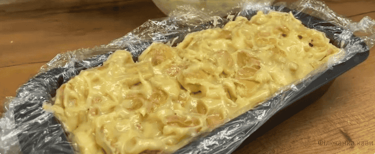 3. Викладаємо поламане печиво та перемішуємо все руками. Масу, що вийшла, викладаємо в форму, застелену харчовою плівкою (у мене форма 30 х 12 сантиметрів). Поступово розподіляємо масу по всій формі. Зверху загортаємо харчовою плівкою та відправляємо в холодильник на 2-3 години.