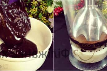 Мусовий крем: Желатин замочити у холодній воді. Гарячим молоком заливаємо шоколад, чекаємо доки він підтопиться і перемішуємо.
