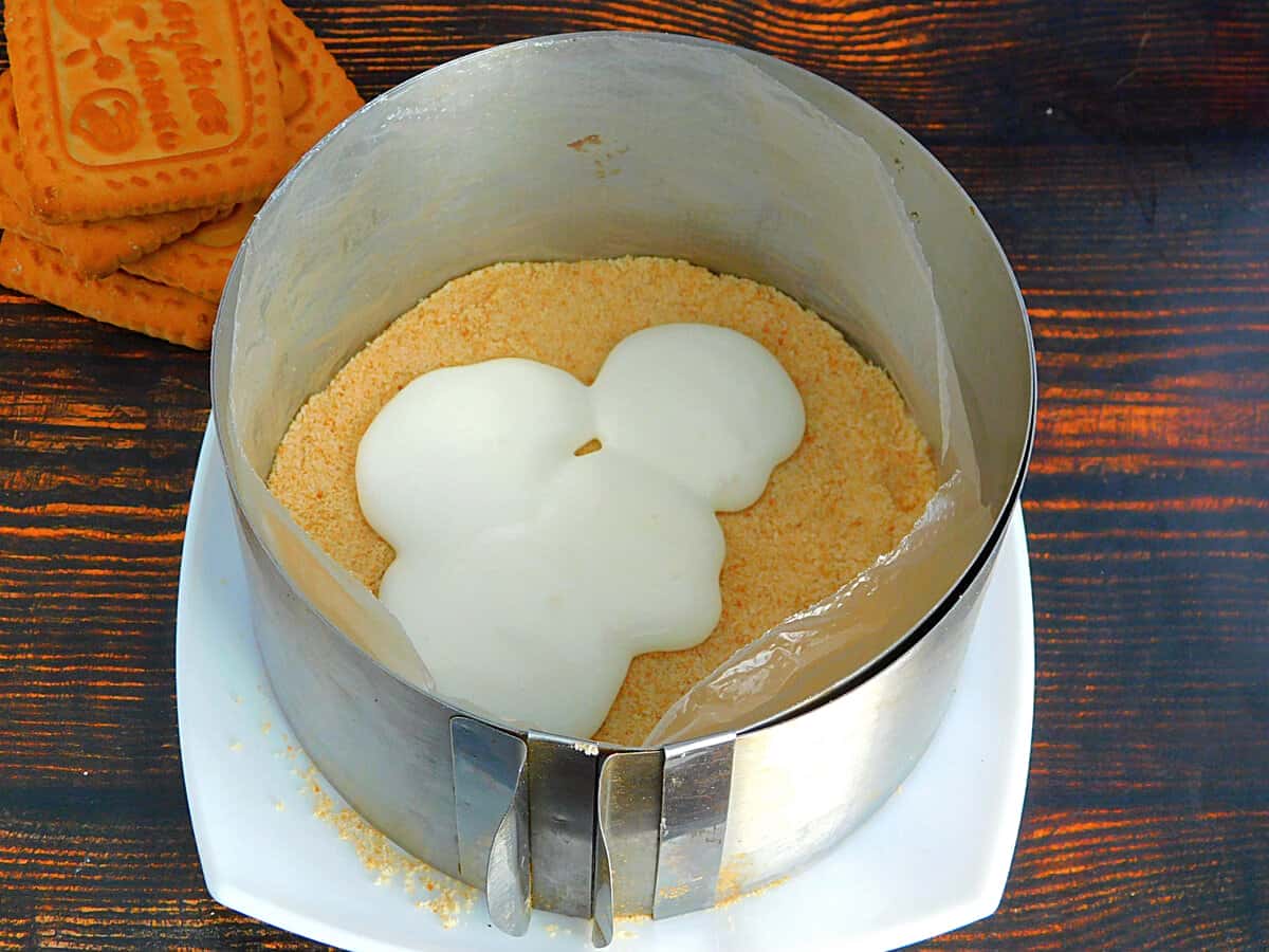 5. Збирати зручно в кулінарному кільці, тут діаметр 16 сантиметрів. Стінки прокласти целофаном, так торт краще відокремиться від форми. Встановити кільце на тарілку і висипати п’яту частину пісочних крихт. Розподілити рівним шаром. Зверху викласти четверть сметанного крему.