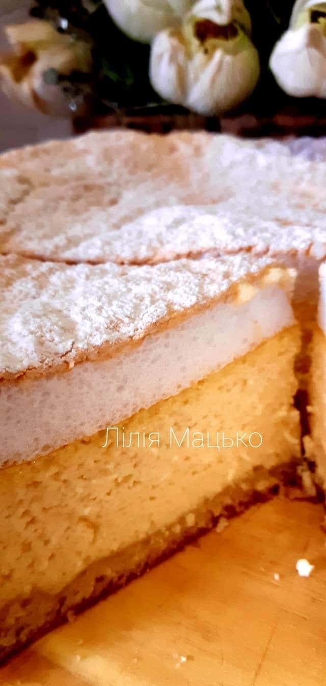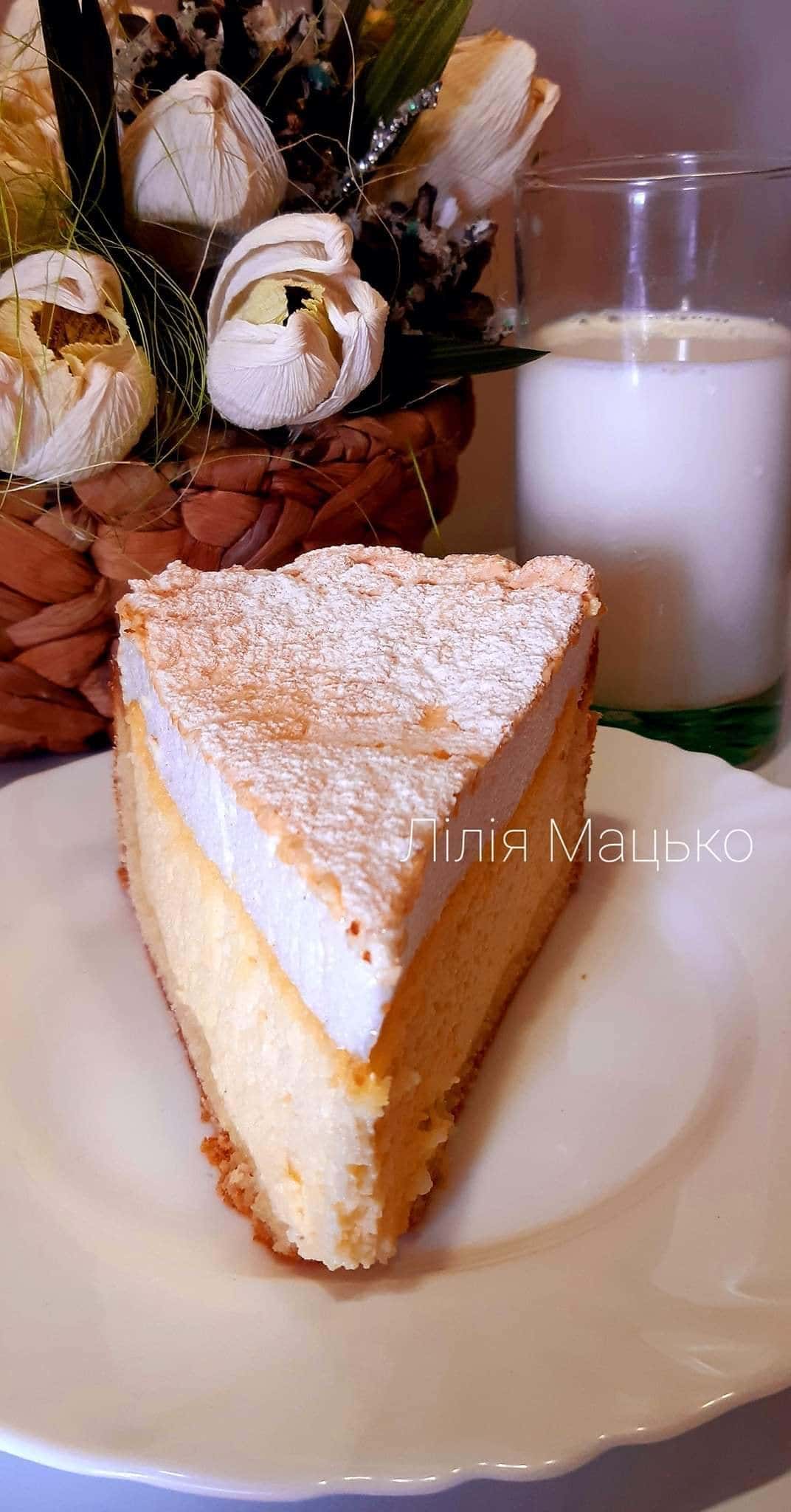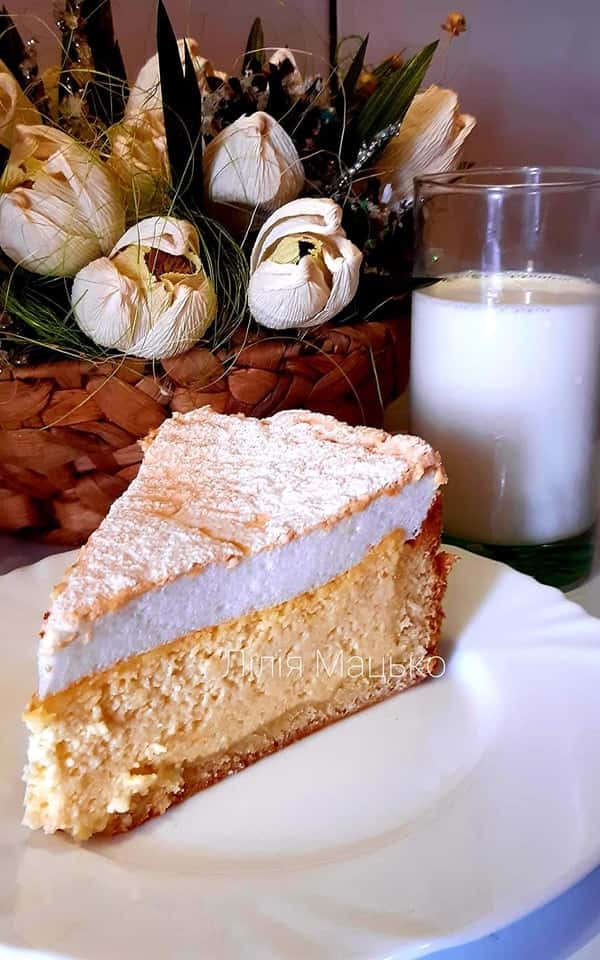 - 6 білків (2 з тіста, 4 з сиру) збити з 200 г цукру до стійких піків.
