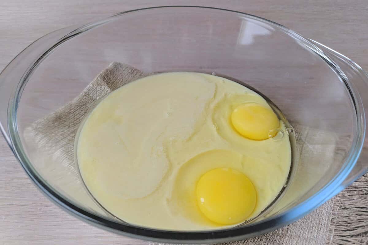2. У глибокий посуд вливаємо згущене молоко. Миємо і вбиваємо яйця.