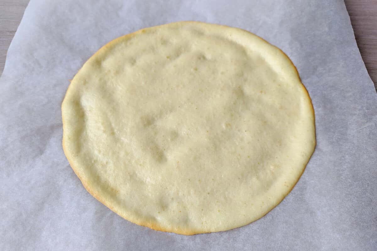 6. Кладемо акуратно папір на деко і відправляємо в розігріту духовку. Випікаємо при температурі 180 градусів 5 хвилин. Час буде залежати від діаметра і товщини тіста. Корж готовий, коли він злегка зарум’яниться. Якщо дозволяє розмір дека, то можна одночасно випікати 2 коржі. Таким чином випікаємо всі коржі. У процесі готування складаємо їх один на одного, чергуючи з папером для випікання, так як вони будуть злипатися.