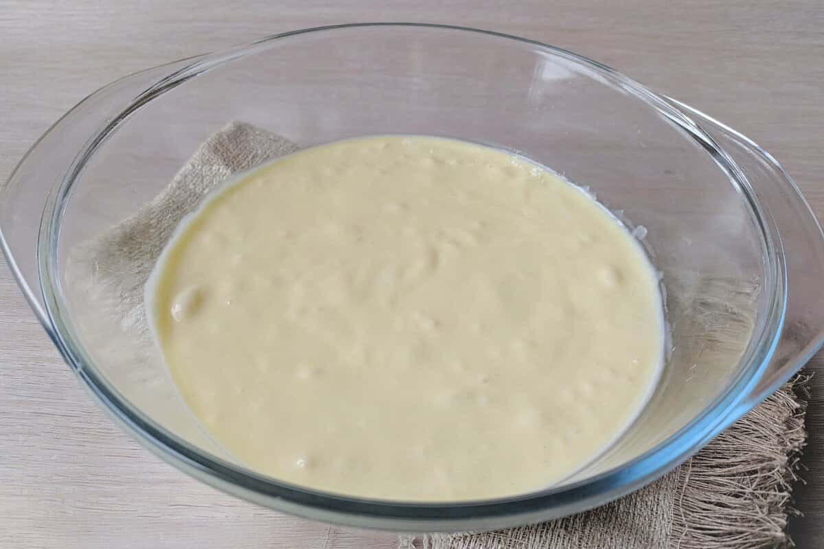 4. В окремій мисці змішуємо борошно з розпушувачем і частинами всипаємо в яєчну суміш. Збиваємо міксером до отримання однорідної маси.