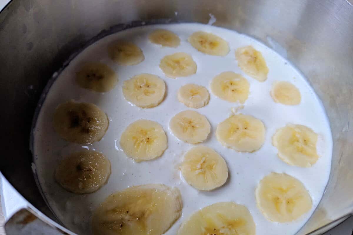 7. Готуємо крем. Для цього збиваємо 400 грам густої сметани і 120 грам згущеного молока. Згущене молоко в кремі можна замінити на цукор або цукрову пудру. На тарілку, де буде збиратися наш торт, кладемо кондитерське кільце і приступаємо до збірки. Охолонувші коржі бажано обрізати по краях, приклавши зверху тарілку, щоб торт був більш рівний. Кладемо корж, змащуємо його кремом. За бажанням можна зробити невеликий прошарок з банана – нам це дууууже смакує.