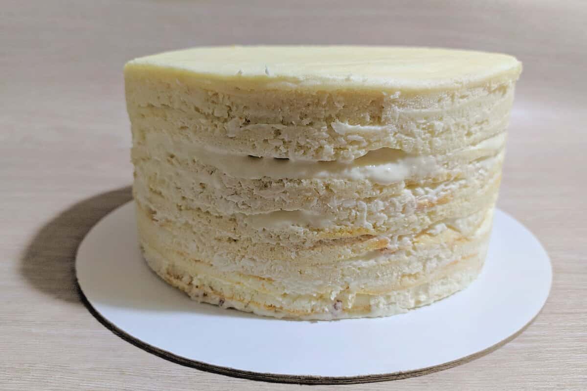 8. Таким чином збираємо весь торт. Накриваємо зверху харчовою плівкою і відправляємо в холодильник на ніч або на 8 годин.