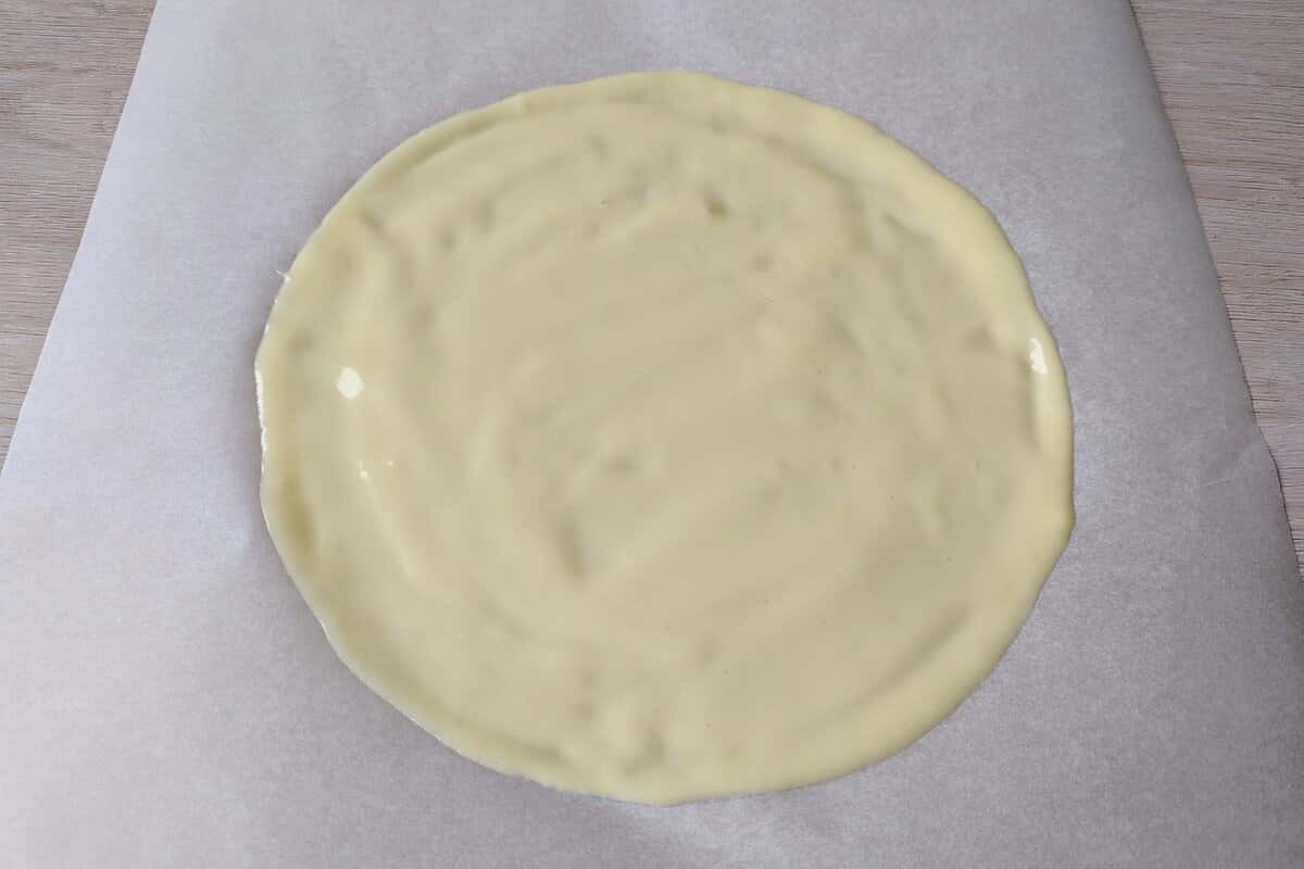 5. На папері для випікання малюємо коло необхідного діаметру. Зручно для цього обводити кондитерське кільце, кришку від каструлі або тарілку. Перевертаємо іншою стороною папір і виливаємо в коло в залежності від діаметра 1-2 столові ложки тіста. Розділимо рівномірно по поверхні, не виходячи за кордон кола. Якщо не виходить акуратно, то нічого страшного. Все одно перед складанням ми будемо рівняти краї.