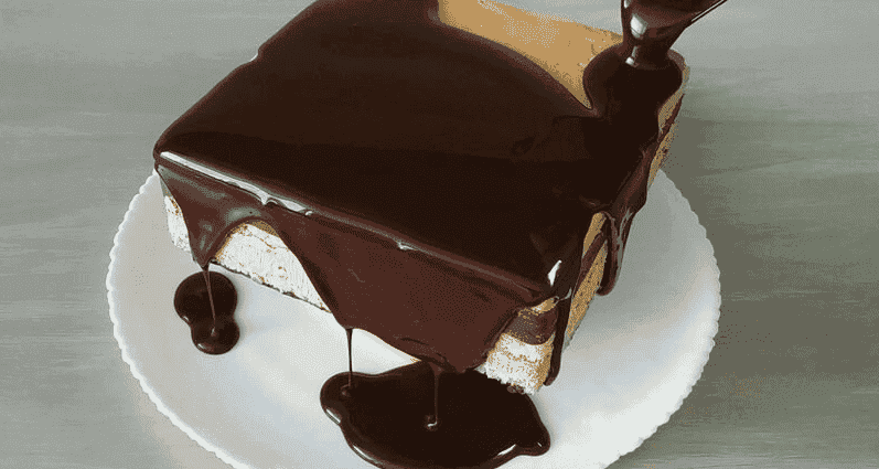 Дістаємо торт із морозильної камери. Поливаємо зверху глазур’ю.