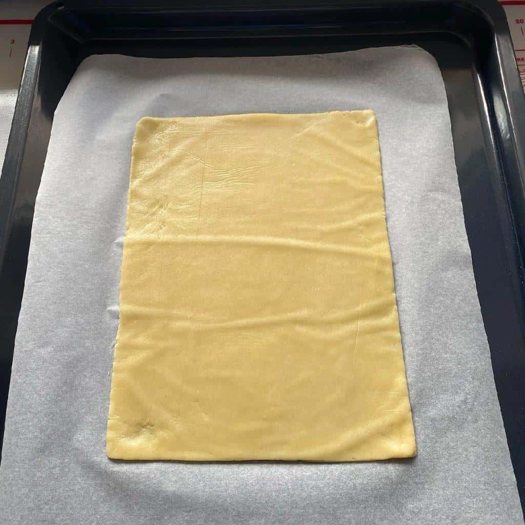 - Дістати з холодильника шматочок світлого тіста, на папері для випічки розкотити прямокутний пласт шириною 2-3 мм.
