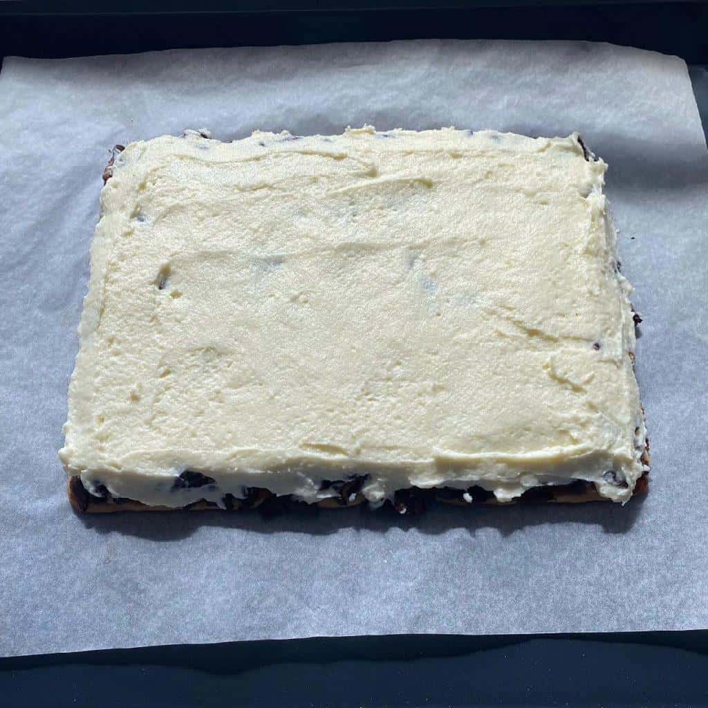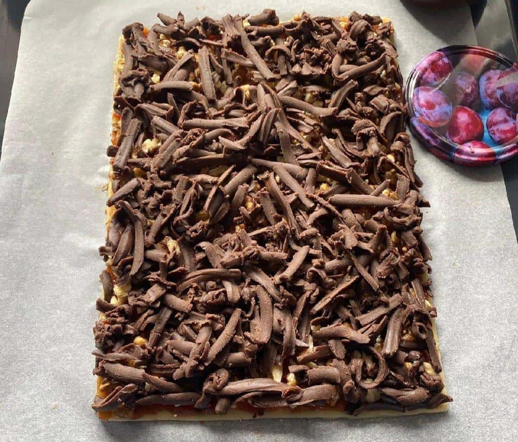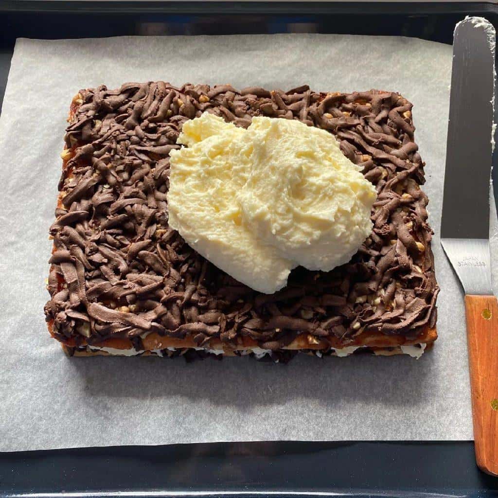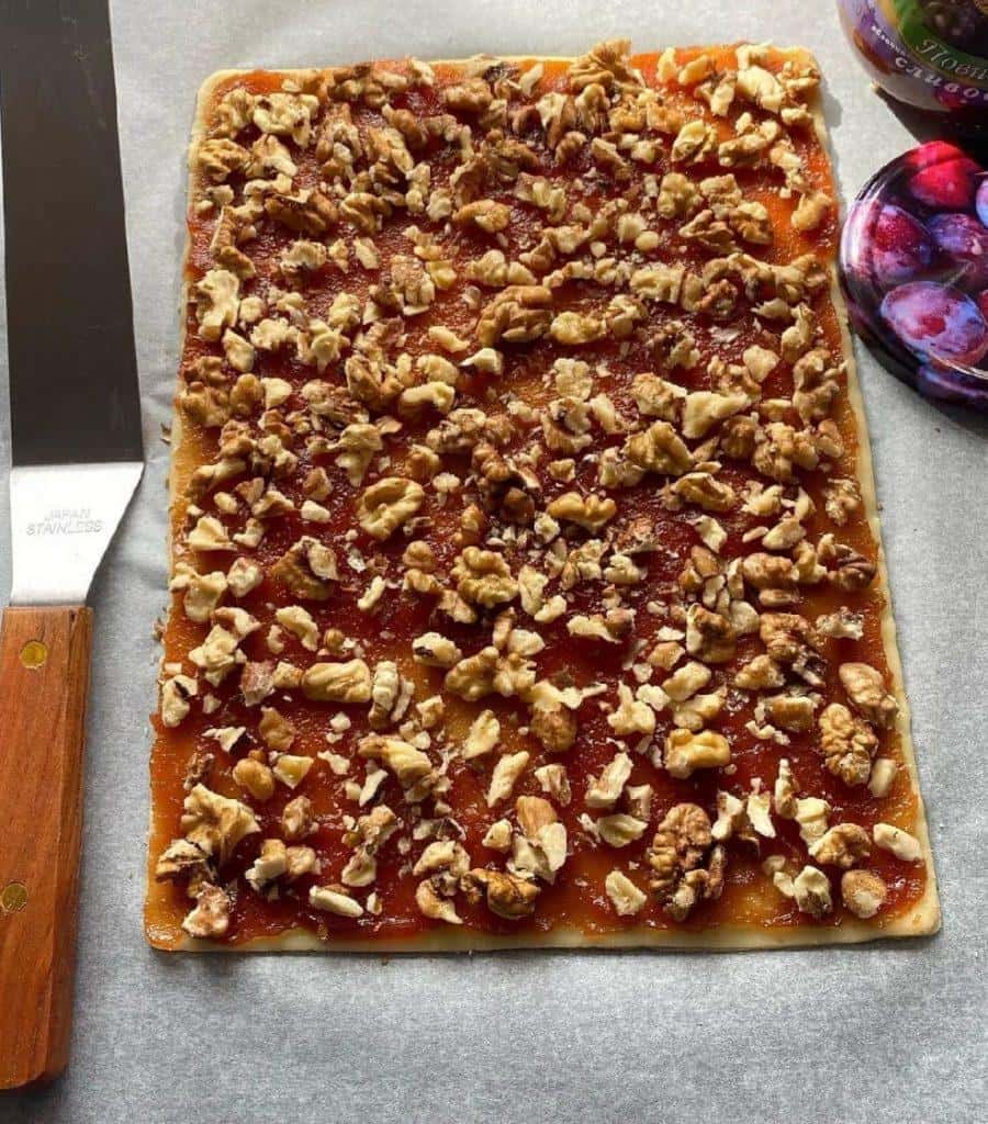 - Тісто змастити повидлом, викласти рубані горіхи.