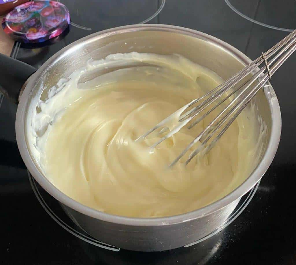 - У каструльку насипати крохмаль, додати вершки, розмішати, щоб не було грудочок, додати згущене молоко. Поставити на середній вогонь та варити до загустіння при постійному помішуванні.