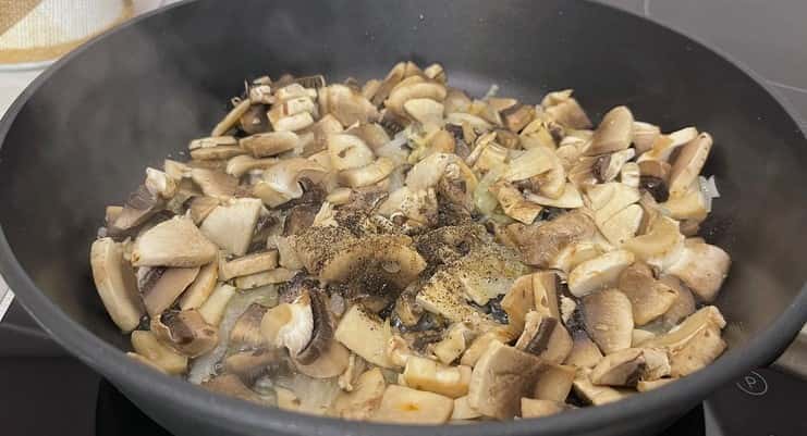 - Нарізаємо печериці. Додаємо печериці до цибулі для обсмажування. Додаємо сіль та чорний перець за смаком.