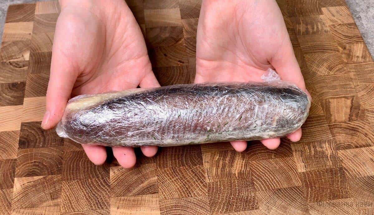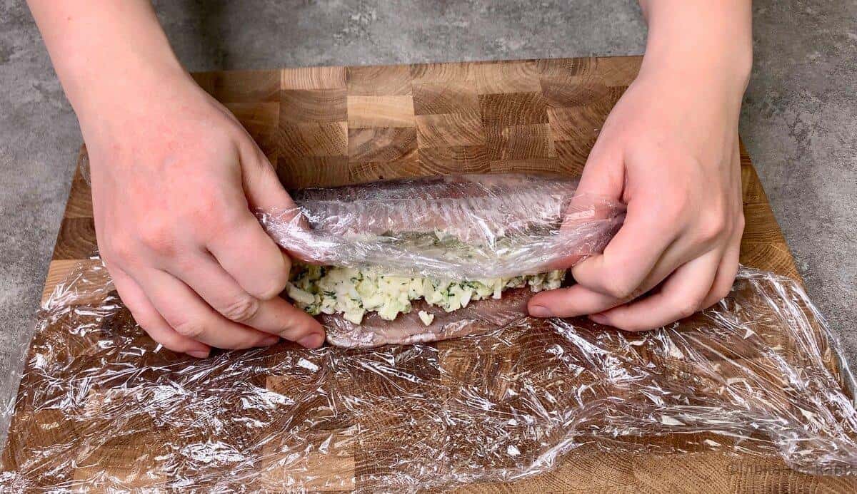 - Викладаємо начинку на підготовлене філе, щільно загортаємо в рулет, потім обертаємо в харчову плівку і прибираємо в холодильник мінімум на 2-3 години, а краще залишити на ніч.