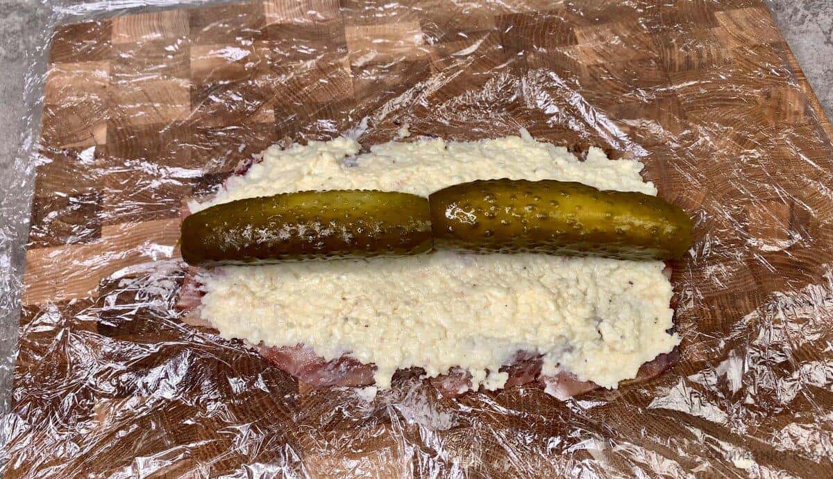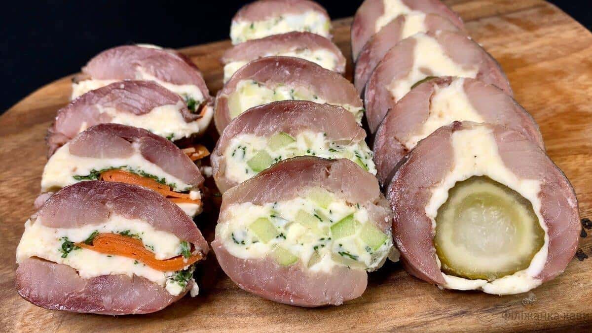 - Розділимо начинку на філе, зверху викладаємо маринований огірочок, щільно загортаємо в рулет і прибираємо в холодильник.