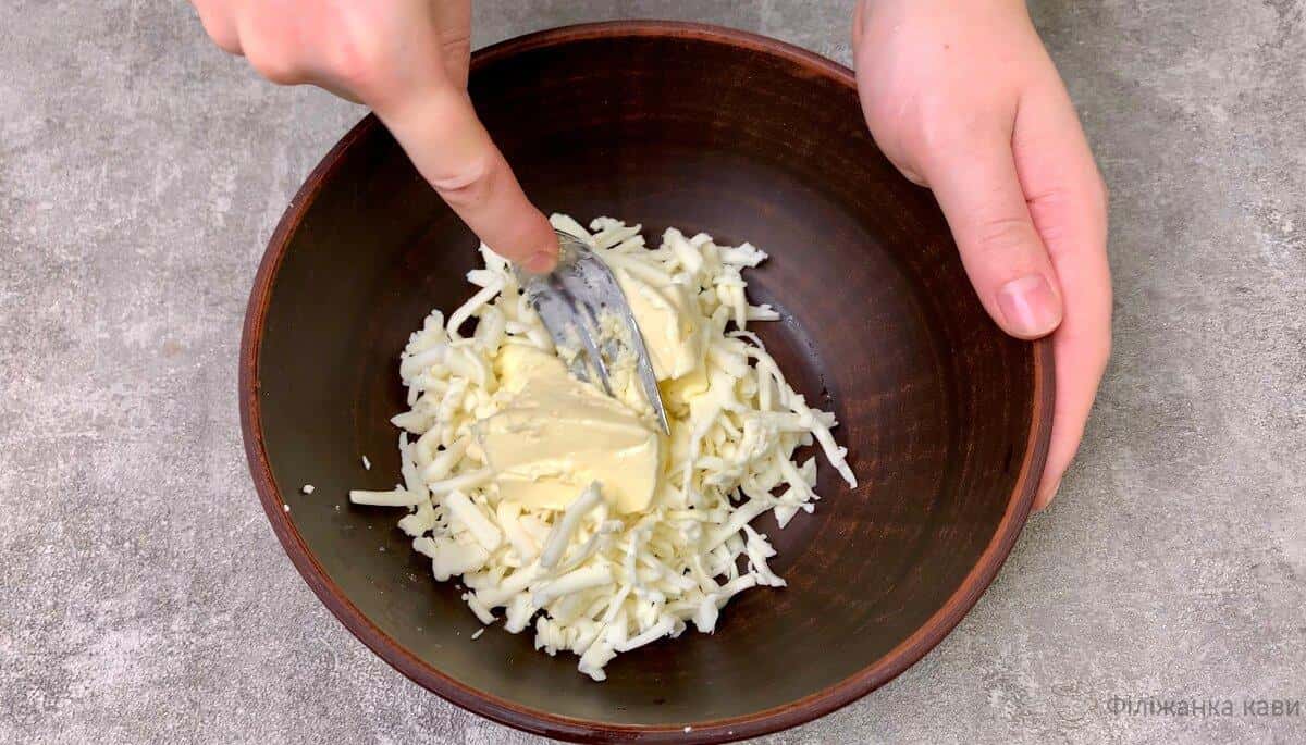- Для другої начинки знову змішуємо тертий плавлений сир, вершкове масло і злегка присипаємо чорним меленим перцем.
