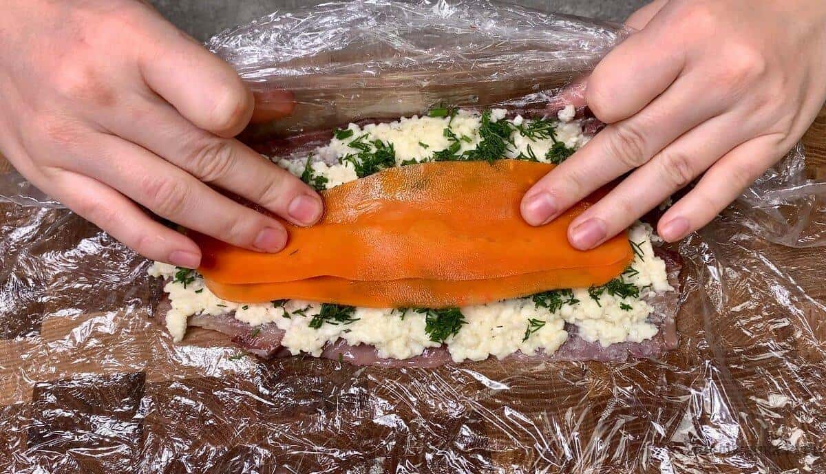 - Розділимо начинку на філе, посипаємо кропом, викладаємо смужки маринованої моркви і щільно загортаємо в рулет. Аналогічно першому рецептом прибираємо в холодильник на 2-3 години, а краще на ніч.