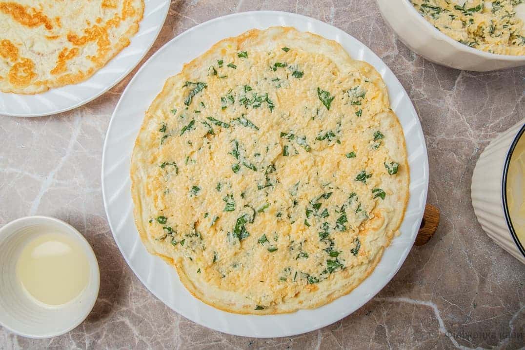 - У сковороді розігрійте олію. Невеликими порціями викладайте яєчну суміш і розподіляйте на дно сковороди для отримання тонких млинців. Обсмажуйте до рум’яності з обох боків.
