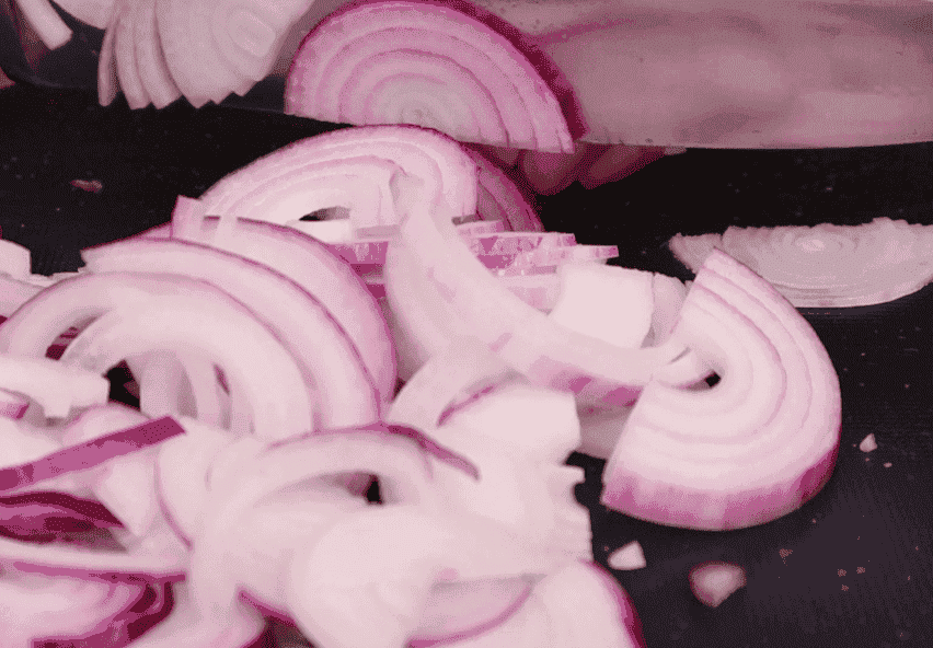 Червону цибулю нарізаємо півкільцями, якщо червоної немає, підійде і звичайна.